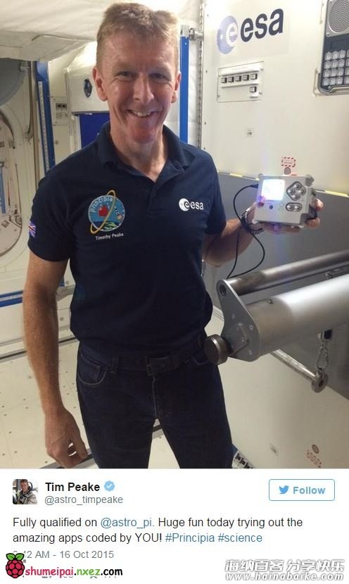 Tim Peake前几天在自己的Twitter上晒出了自己与Astro Pi的合影