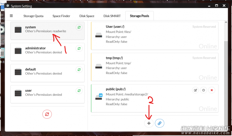然后转到 ArozOS 的 System Settings > Disk & Storage > Storage Pools,并按如下方式进行设置(请参阅随附的示例配置)。
