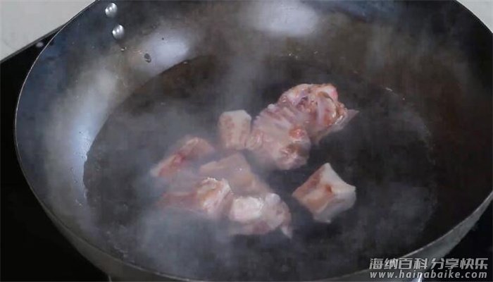 3、锅中放入适量清水大火烧开,放入排 骨、姜片、料酒5克焯水2分钟,捞出备用;