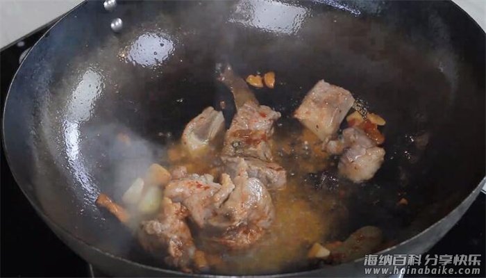 5、放入排骨翻炒1分钟,调入料酒5克、生抽10克、老抽3克翻炒均匀,加入适量清水大火烧开,转小火焖20分钟;